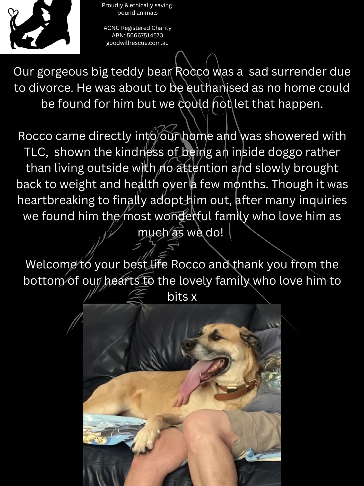 Hendrix (now Shadow) was found unwanted with his 2 brothers by the most amazing young couple. After speaking with their homeless owner and us offering yet, being declined to desex their mumma dog, the 3 puppies landed on all 4 paws and went home with the couple whilst their vetwork was completed. Shadow has found his forever home and this stunning big boy is how not only surviving but, thriving!
